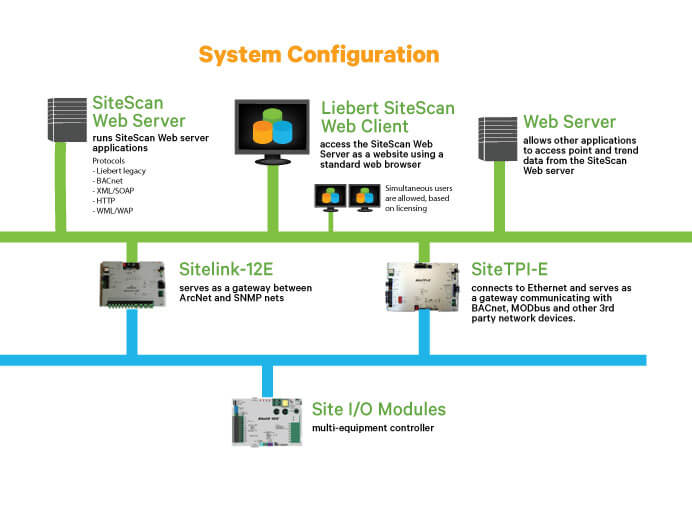 Liebert SiteScan allows monitoring and control of virtually any piece of critical support equipment — whether located in the next room or in a facility on the other side of the country. This web-based data center monitoring system provides centralized oversight of Liebert precision air, power and UPS units, as well as many other analog or digital devices. Features include real-time monitoring and control, data analysis and trend reporting, and event management.